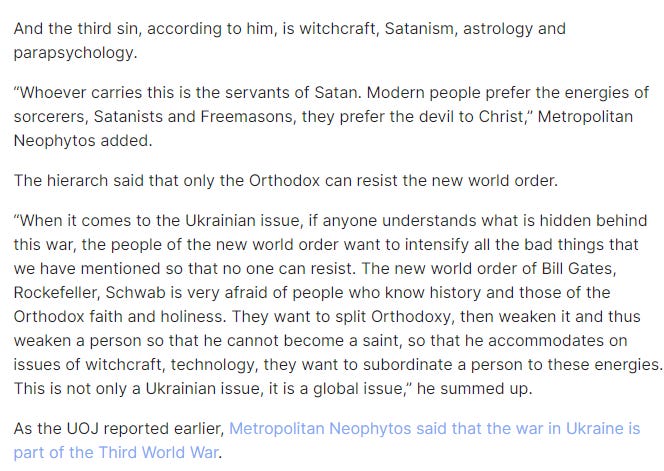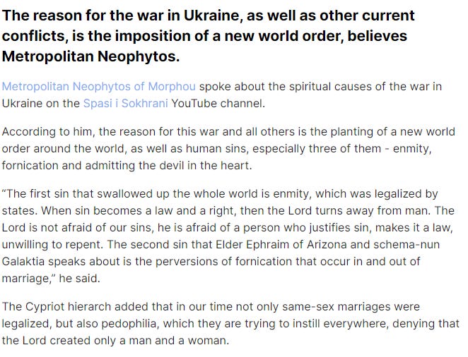 Metropolitan Morphou Interview Identifies Enmity, Sexual Perversions, and Witchcraft as the Three Primary Sins Causing Conflict in Ukraine.